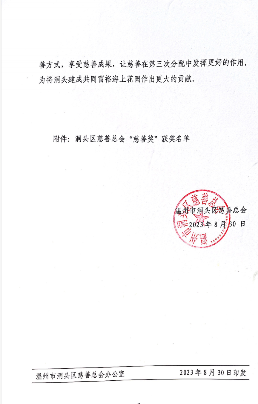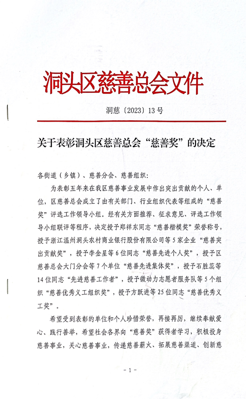 關于表彰洞頭區慈善總會“慈善獎”的決定